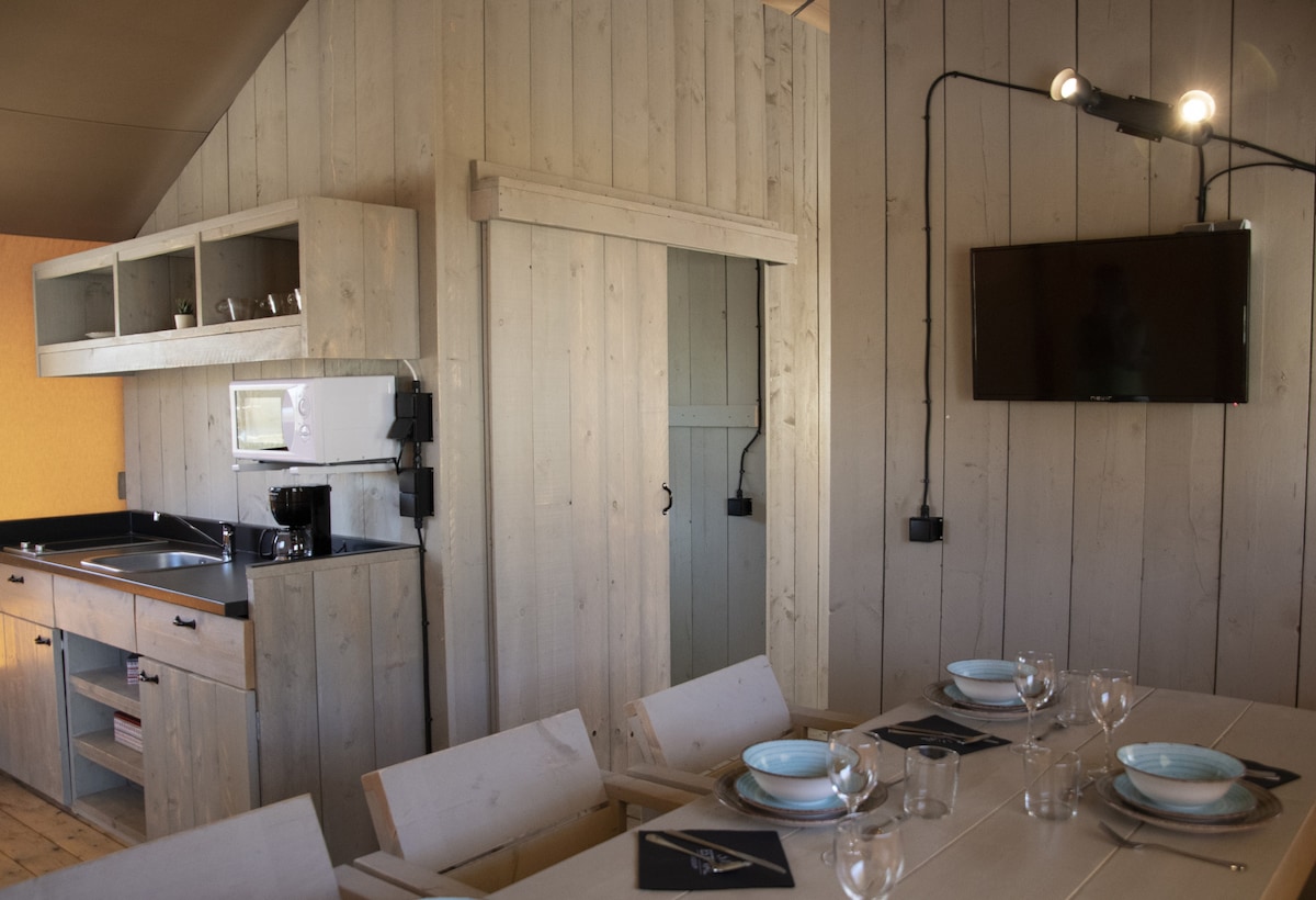 An open air holiday in a comfortable solution: first bedroom with 1 bunk bed and a single bed, and a second one with a double bed; bathroom with shower, hairdryer, linen and courtesy kit. Living room with equipped kitchenette, small fridge and veranda. Our tents are located in a panoramic position, and is possible to enjoy the pools in our Resort - seasonal opening. Easily accessible by car, with a big and free of cost parking; outdoor tub for exclusive use, air conditioning, TV and free wi-fi.