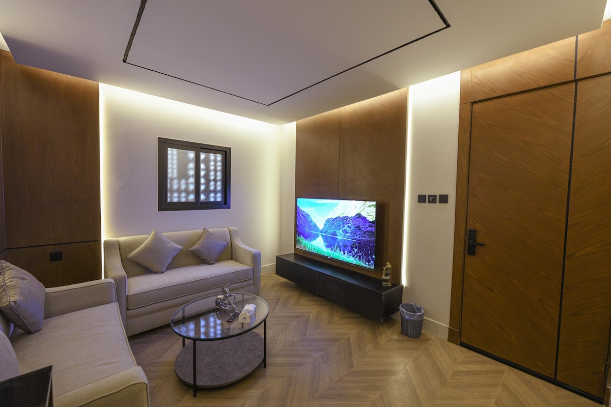 Profitez d'une expérience unique dans un studio de style classique ancien qui offre détente et confort. Le studio dispose d'un lit et d'un coin salon extérieur où vous pourrez regarder un écran intelligent de 65 pouces. Il y a également une cuisine séparée et du café pour répondre à tous vos besoins et un élégant espace extérieur avec un foyer. L'emplacement est proche de tous les services, des destinations touristiques et des zones saisonnières de Riyad (Boulevard, Arena, etc.) Dans 5 à 10 minutes 1762061027