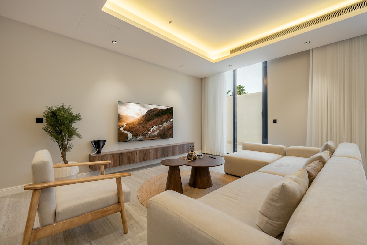 Un appartement moderne conçu pour un séjour exceptionnel, situé dans l'un des plus beaux quartiers de Riyad avec une vue imprenable sur KAFD. Il dispose d'un coin salon extérieur avec un écran et un projecteur pour des soirées agréables. Pour votre confort, le lit comprend une couche supplémentaire de 14 cm de haute qualité. « Nous proposons également des services de coordination d'événements pour des occasions spéciales (y compris des gâteaux et des accessoires) moyennant des frais supplémentaires et sur réservation préalable, pour une expérience inoubliable. »