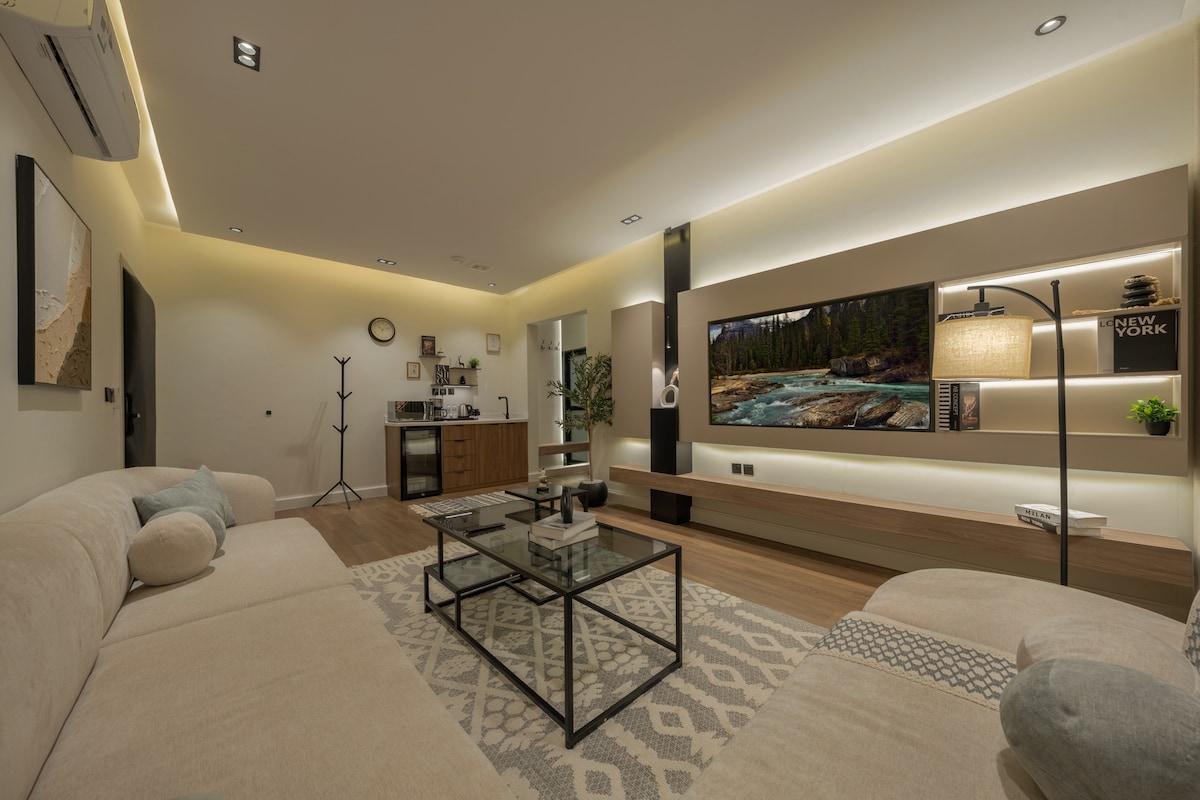 Profitez d'un logement élégant situé au nord d'Al Malqa. Livré avec serrure intelligente et isolation de porte pour un séjour extrêmement confortable. Situé au nord de Riyad et à seulement 20 minutes de l'aéroport, à 5 minutes des zones de divertissement saisonnières de Riyad et à 10 minutes de la ville historique d'Al-Diriyah. L'appartement est équipé d'une connexion Internet haut débit par fibre optique, d'une télévision LED 4K de 65 pouces, d'un lit King Size avec matelas supplémentaire pour un sommeil confortable et d'un parking gratuit.