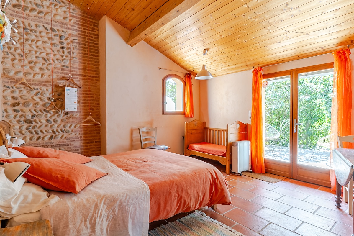 Suite de charme en duplex, attenante maison du Lauragais en briques et galets. Entrée indépendante. Jusqu'à 5 P + BB. Voir site Maison d'hôtes Les Couleurs du Vent. Petit déjeuner maison inclus, essentiellement bio et local. Dîner en sus à partir de 19€. Végé possible. Belle campagne. Balades. Toulouse à 20 kms. Transports en commun. RdC : chambre lit 160. Etage : petit salon, coin bureau, matelas 140 et 90 sur plateforme. Salle d'eau et WC séparés. Suppl. 13 €/nuit pour 2 lits si 2 voyageurs.