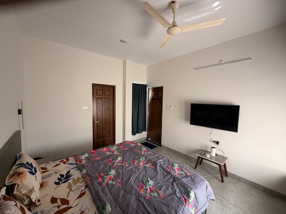 Entièrement privé sans partage d'espace, un petit appartement d'une chambre studio avec une dalle pour la cuisine et la salle de bain attenante. Nouvelle climatisation, placard, lit Queen Size avec matelas orthofoam, idéal pour deux personnes. La cuisine contient une plaque à induction pour cuisiner avec des ustensiles et des récipients de cuisine. Connexion Internet haut débit pour le travail à domicile Google TV avec toutes les applications, climatisation, réfrigérateur, four, geyser, chaises, fer à repasser, etc., tout y est. Endroit entièrement ventilé avec 2 grandes fenêtres. Nous avons besoin d'une pièce d'identité pour tous les voyageurs.