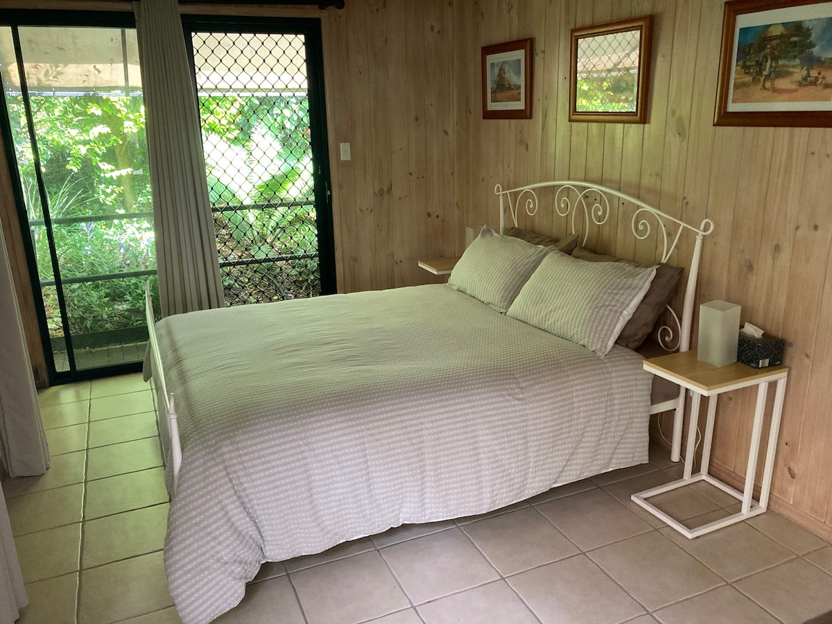 Belle unité indépendante, peut accueillir jusqu'à quatre adultes, 1 x queen 2 x single, possibilité d'accueillir plus (lit de voyage et chaise haute disponibles) bain sur pieds, cuisine, salon, wifi et télévision. Espace extérieur, accès au foyer, barbecue et four à pizza. Aire de jeu pour enfants. Grand parking. Situé dans 170 acres de brousse, poules, canards, pintades et des tas d'animaux et de plantes indigènes. Sur l'autoroute à mi-chemin entre Gladstone et Rockhampton, arrêt idéal pour une nuit reposante ou des jours d'exploration.