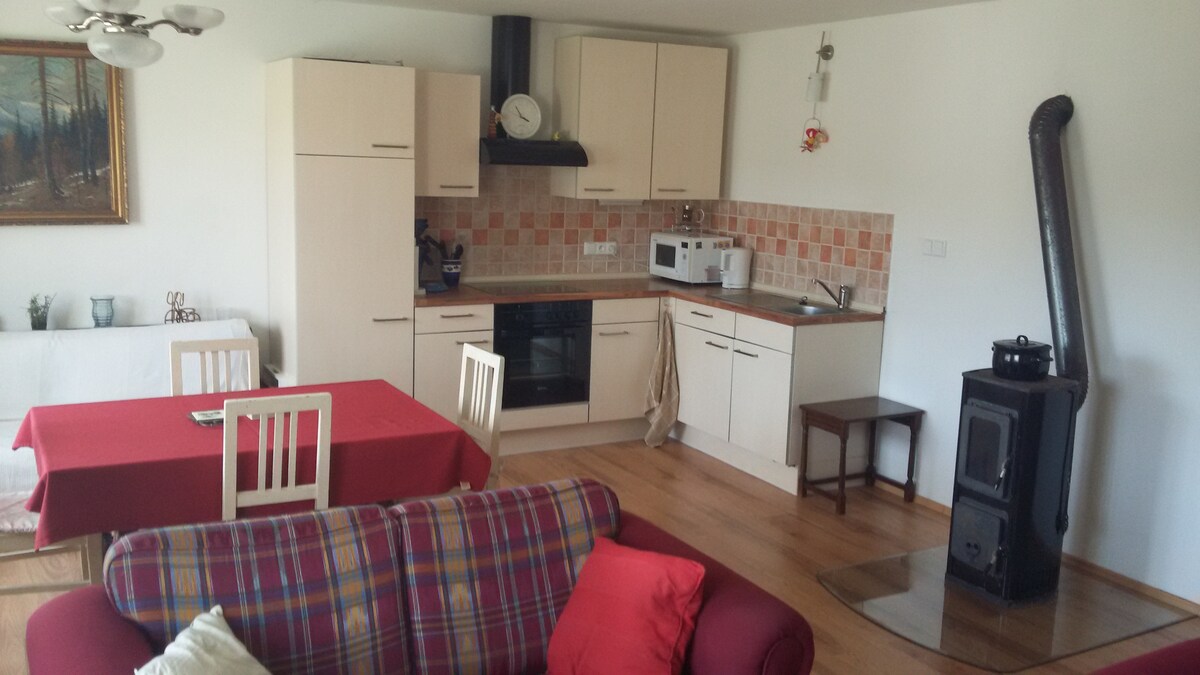 40m2, style chalet, appartement avec toilettes et douche, lit double pour 2 personnes et canapé pour 1, cuisinière, télévision, wifi,BIÈRE PRESSION, petite cuisine- (micro-ondes, cuisinière électrique, bouilloire, grille-pain, cafetière Dolce gusto ) il y a une piscine saisonnière, un jacuzzi extérieur toute l'année, une cave à vin, un ping pong, un barbecue extérieur et intérieur et une cheminée, des jouets pour enfants, un parking, une piste cyclable, une tour d'observation, une piscine et un été de 4 km, tennis.kurty 3km, parc de golf plzen 13 km, stade d'hiver à 3,5 km, Pilsen 17 km,Prague 70 km