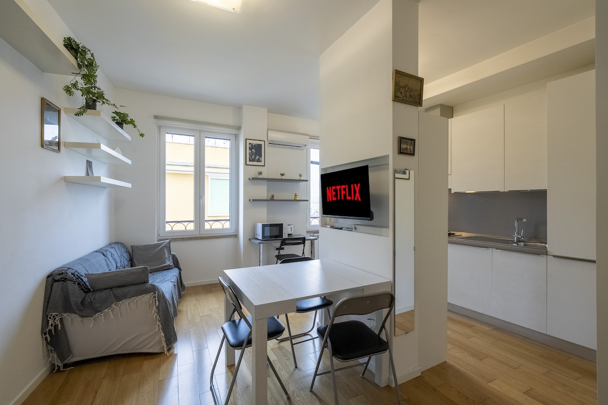 L’appartement avec terrasse, situé au 8e étage d’un bâtiment historique, équipé d’un ascenseur vient d’être rénové et joliment meublé. Composé d'un salon avec un canapé, une télévision intelligente avec les différents services de Netflix, Amazon Prime et une belle table basse. - La petite kitchenette est entièrement équipée avec tous les ustensiles utiles, micro-ondes, réfrigérateur-congélateur et bouilloire. Climatisé, avec chauffage et climatisation, il dispose d'une puissante connexion Wi-Fi gratuite utilisable dans toutes les pièces de la maison.