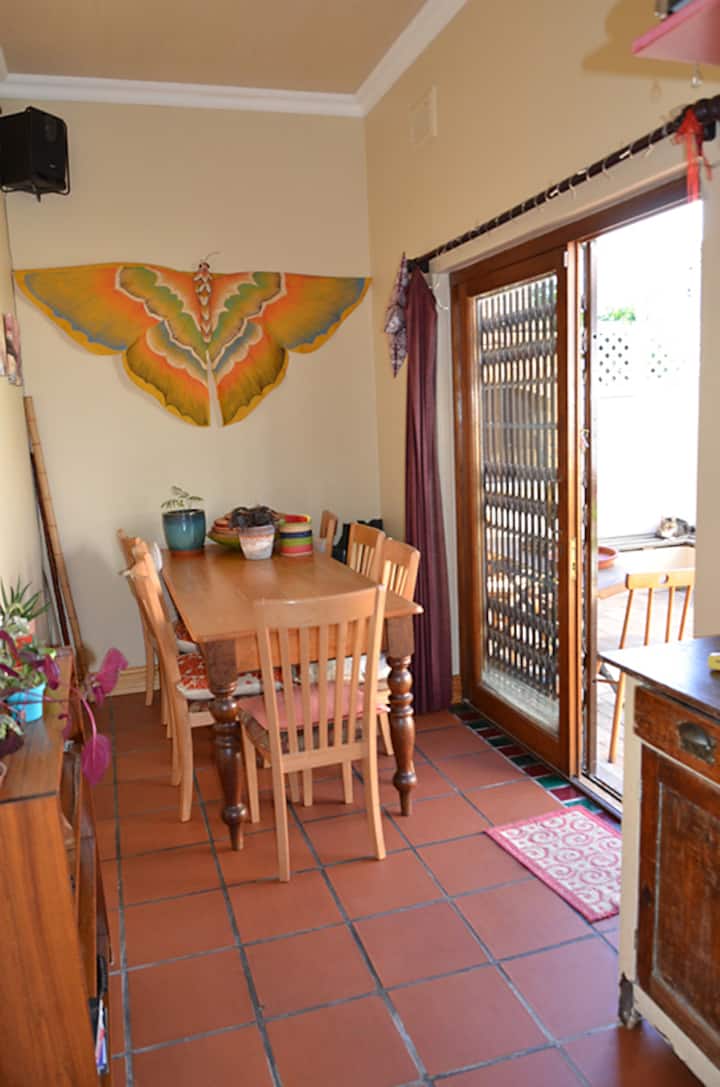 Nous sommes un couple décontracté qui aimerait vous accueillir dans notre maison. La cuisine est l'un de nos plaisirs avec des cueillettes dans notre mini jardin d'herbes et des légumes biologiques de notre épicier local préféré. Nous allumons souvent un feu pour un braai (barbecue) en milieu de semaine, si le temps le permet.