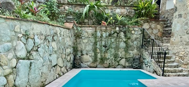 « Quinta Lourdes » ancienne maison traditionnelle des années 1960 en pierre dans un développement prestigieux dans l'un des quartiers les plus exclusifs et privés de Puerto Vallarta, à côté de la jungle. Façade originale