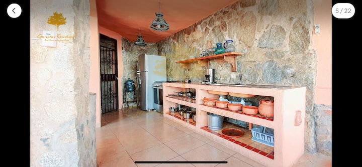 La maison a une vue privilégiée, spectaculaire et beaucoup d'intimité, aménagée avec tout ce dont vous avez besoin et confortable, c'est une maison avec une décoration rustique et accueillante avec l'indispensable, avec un aspect attrayant austère et un style mexicain sur des dénivelés, avec des chambres très indépendantes les unes des autres réparties à différents niveaux, avec leur propre salle de bain complète chacune.