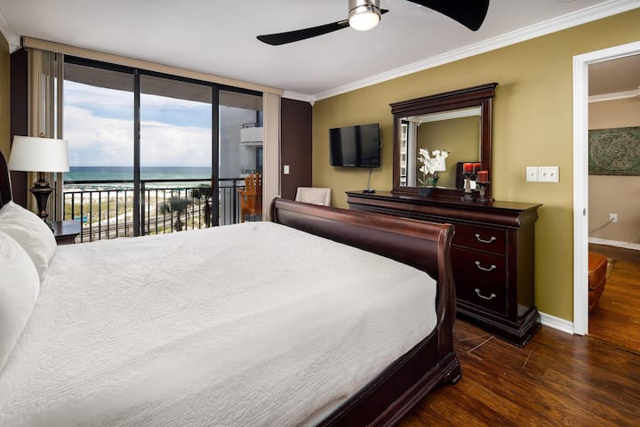 Cette unité de 1 100 pieds carrés avec vue sur le golfe, 4e étage, est magnifiquement décorée. Montez sur votre balcon privé, accessible à la fois depuis le séjour et la chambre principale, et imprégnez-vous de la beauté et de la brise du golfe.