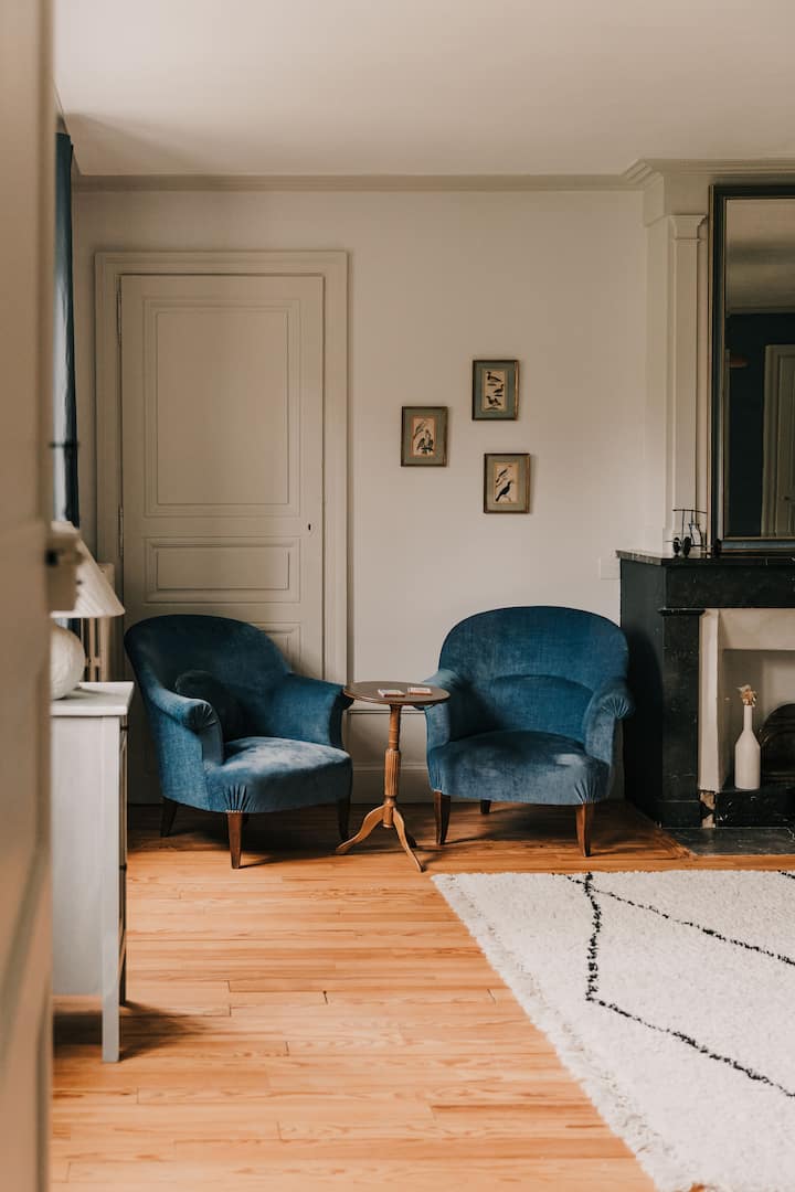 Ambiance et Décoration : Les nuances de bleus, de gris et de beiges créent une toile de fond harmonieuse, tandis que la décoration soigneusement chinée et les matériaux naturels confèrent à l'espace une ambiance chaleureuse.