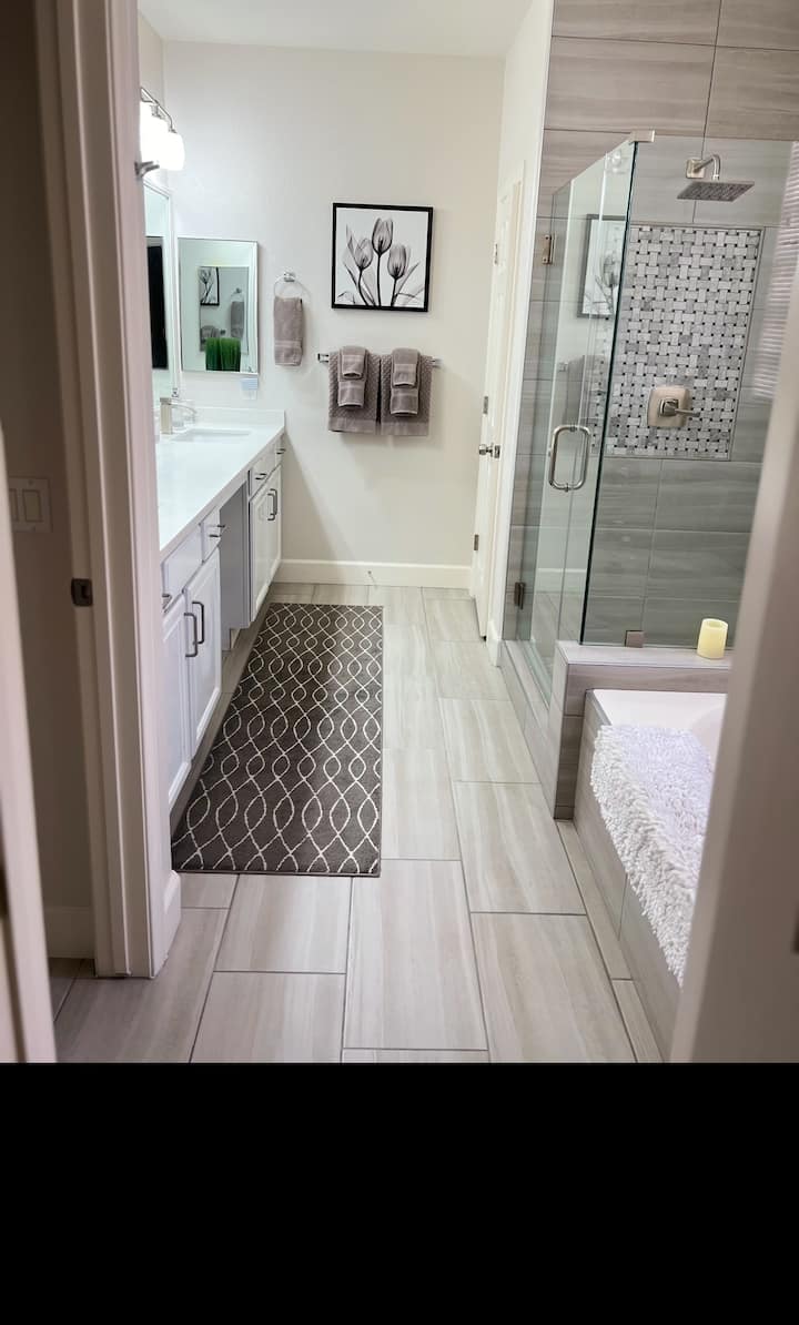 Une belle douche en verre chic à aire ouverte, une baignoire, deux (la sienne et la sienne) avec une salle de bain privée séparée. Tiroirs et placards pour les besoins de votre organisation.