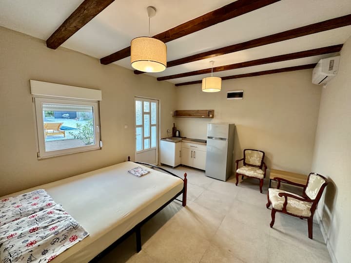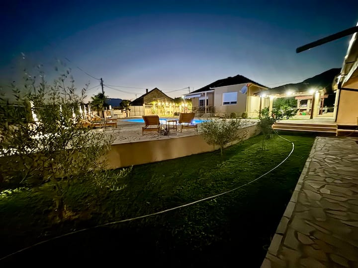 Village ensoleillé, maison avec piscine
