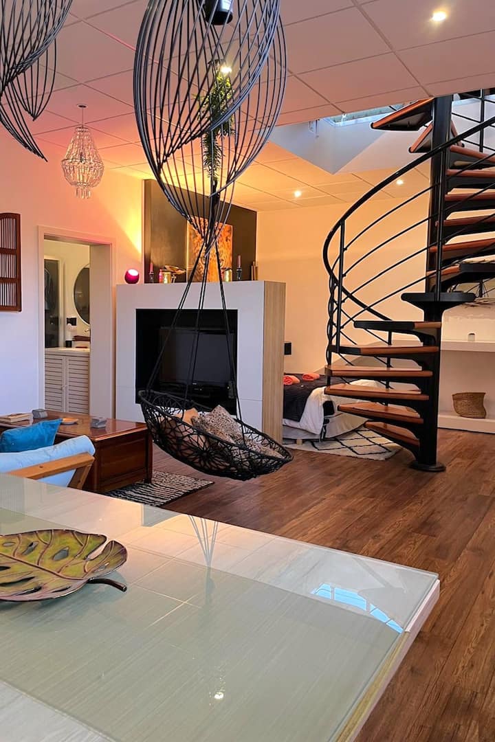 Véritable petit cocon pour 1 à 5 personnes (2 adultes maximum) entièrement à votre disposition, réparti sur deux niveaux, confortable et décoré avec goût... un brin tropical, disposant d'une bibliothèque, cuisine entièrement équipée, connexion Wifi, TV, lit queen size, bureau, tisanerie... pour un séjour dépaysant et zen en pleine nature.