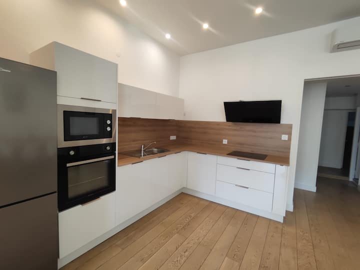 L'appartement climatisé dispose d'une suite parentale avec lit double en 160 et dispose d'une salle de bain avec douche .