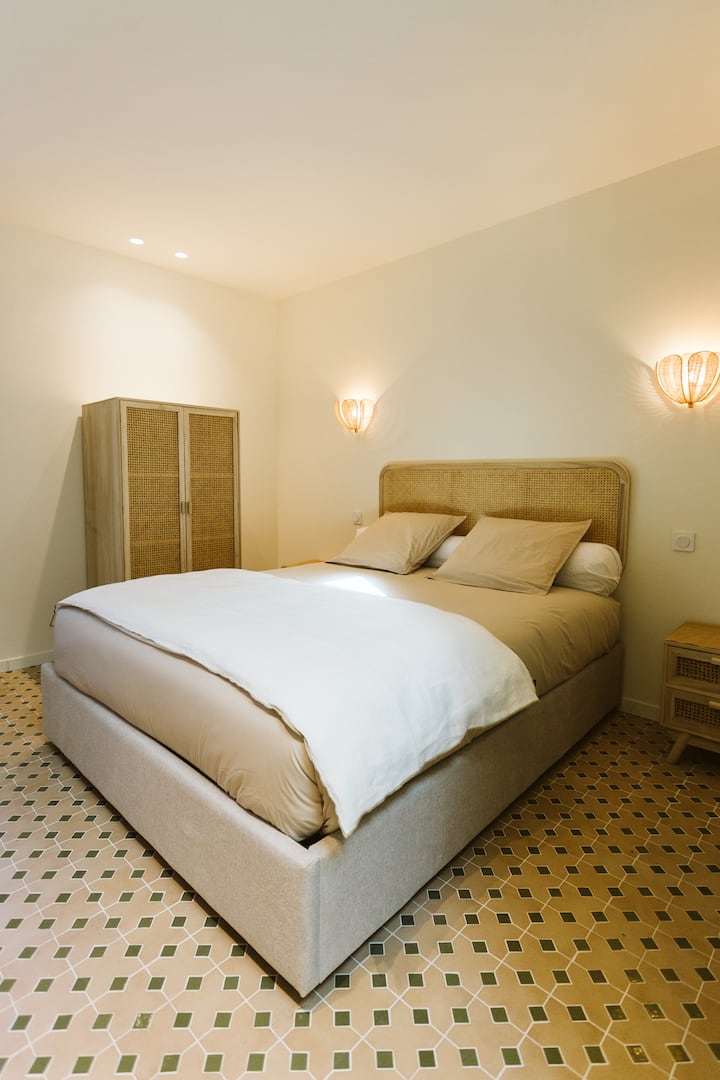 La Chambre dispose d’un lit double Queen Size (160X200), avec vue sur la piscine. La salle de bain attenante dispose d’une douche. Toilette séparé.