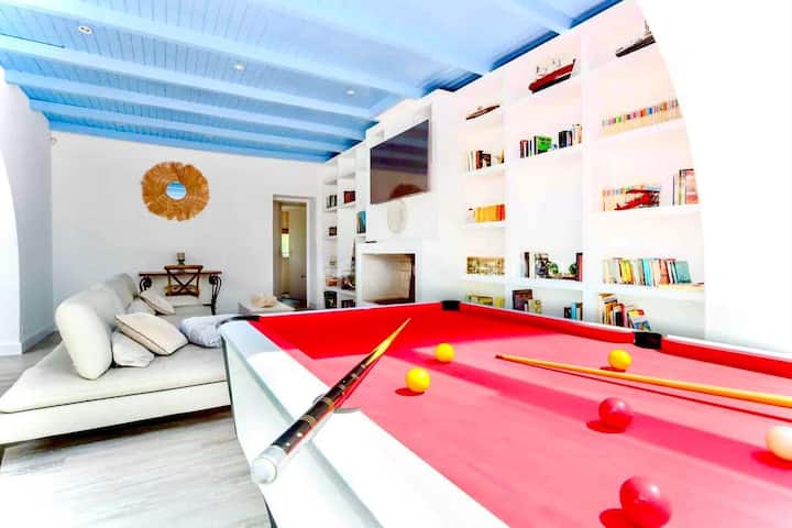 -Un salon confort avec canapé cuir, cheminée, bibliothèque livres tous âges, écran télévision, billard, une guitare Folk pour vos soirées musicales !