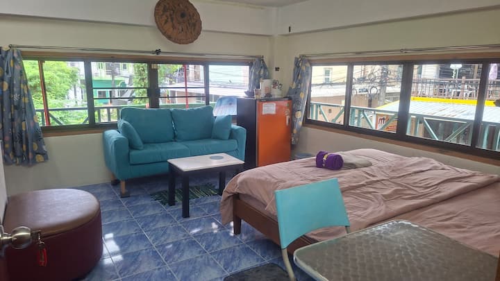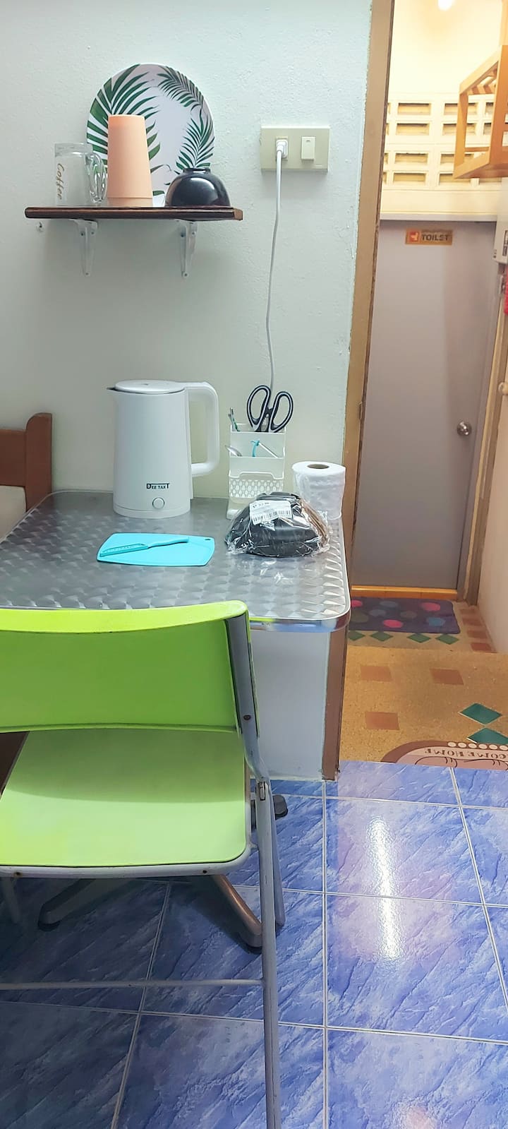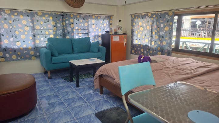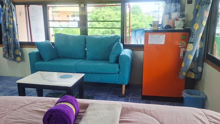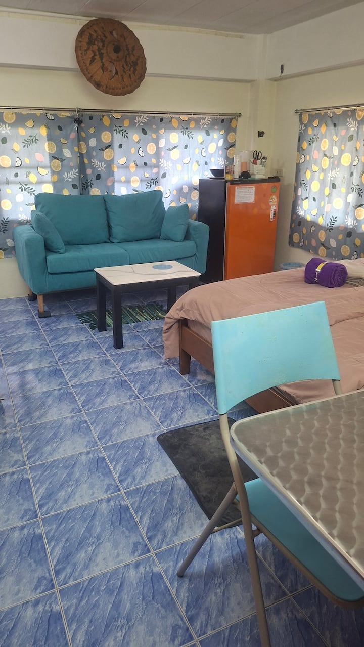 Équipé d'un matelas confortable de 5 pieds, d'une literie, d'un canapé deux places + canapé-lit, d'un réfrigérateur, d'une table à manger/de travail de style café, d'une armoire, d'un ventilateur électrique, d'une bouilloire, d'une casserole, d'assiettes et de couverts.