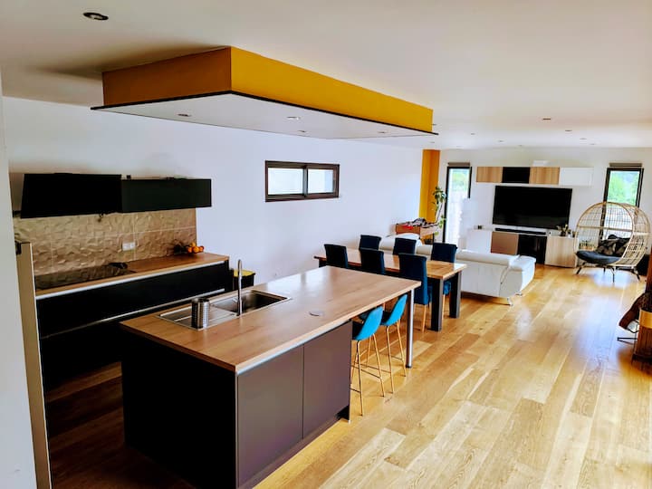 Face à la porte d'entrée, un couloir mène ensuite à la pièce à vivre ( après une pièce buanderie fermée dans laquelle vous pourrez laver, sécher,repasser votre linge). La pièce à vivre toute en longueur se compose d'une cuisine équipée ( frigo américain, four, micro-ondes, lave-vaisselle,plaque de cuisson XL) et d'un îlot central. S'ensuit une table de salle à manger pouvant accueillir 6/10 personnes avec les rallonges. Enfin, vous trouverez dans la prolongation le coin salon avec canapé d'angle ( faisant aussi couchage d'appoint) face à un grand écran plat avec barre de son.