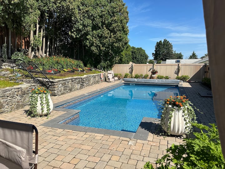 Jardin de cour | Piscine | BBQ + table de feu | Cheminée