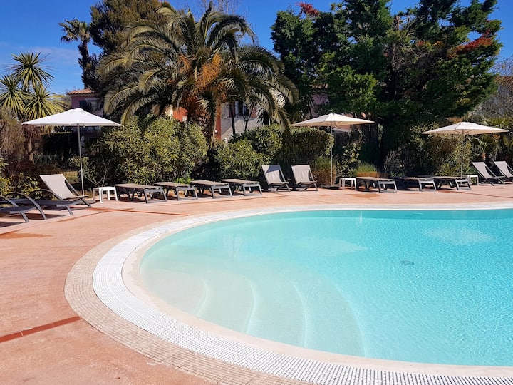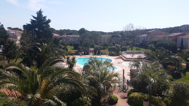 -Le T2 "Orchidées" 5 pers de 31m2 +14m2 de terrasse couverte au rez de chaussé est dans 1 résidence 3* avec piscine et parc. Vue palmiers, climatisé.