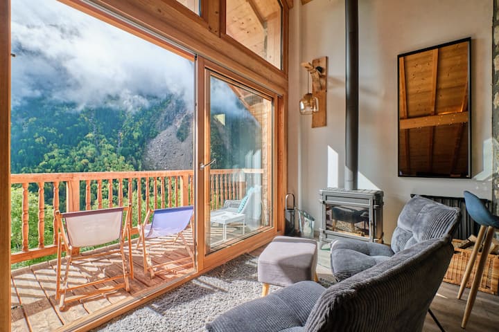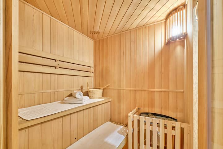 Profitez du sauna traditionnel privé avec pierres volcaniques au rez-de-chaussée de l'appartement et d’une belle et grande pièce à vivre (47m2) avec vue imprenable sur la montagne et sa cascade.