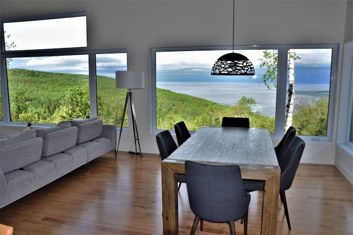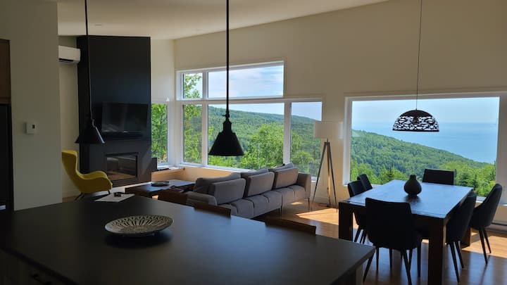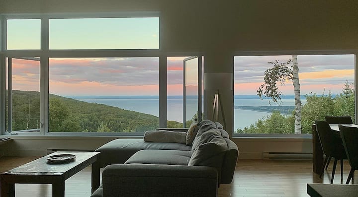 Le Zénith est situé au Domaine Charlevoix à 7 min de Baie St-Paul, 20 min du Massif et 30 min du Casino. Localisé sur le flanc d'une montagne à 350 m, notre chalet a été conçu pour vous permettre de décrocher en pleine nature et à proximité des attractions de la région. Vous aurez accès à des sentiers d'écotourisme sur le site même. Cette résidence de prestige pleinement équipée saura combler vos attentes avec sa vue époustouflante sur le St-Laurent et la montagne.
