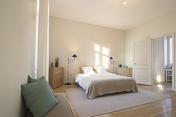 Cette suite, au premier étage est un cocon de raffinement et de confort. Elle offre un grand lit double, parfait pour des nuits paisibles. La suite est baignée d’une lumière douce grâce à de larges fenêtres donnant sur les jardins. La salle de bain attenante, élégante et raffinée, dispose d’une douche à l'italienne et de deux meubles vasques en pierre, elle est idéale pour un moment de détente en toute intimité.