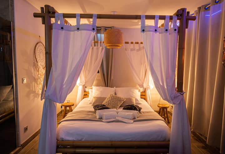 L’espace nuit vous transporte directement à Bali avec son lit à baldaquin en bambou de l'Île de Bali, en queen size (160x200), prêt à votre arrivée. La literie haut de gamme, la couette moelleuse et deux oreillers par personne garantissent un confort absolu. Les jeux de lumière diffusent une lueur douce et romantique pour des soirées à deux, hors du temps.