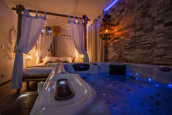 Bien plus qu’une simple love room avec spa privatif, c’est une invitation au voyage, un moment suspendu entre détente et émotion, une expérience unique à deux, mêlant romantisme, détente et évasion.