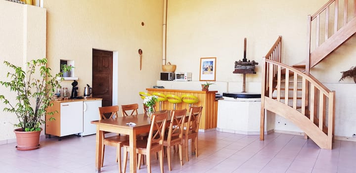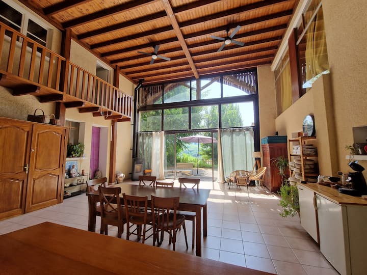 Dans une ancienne ferme rénovée entourée d'arbres et de verdures, vous trouverez une charmante chambre aménagée d'un lit Queen Size (literie de qualité), sa petite salle de bain indépendante ainsi qu'un espace détente et kitchenette dans une grande et lumineuse verrière de 75 m2. L' accès est indépendant. Vous êtes totalement autonome.