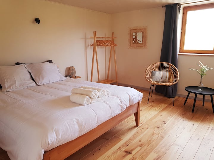 La suite au style chaleureux et cocooning ( composée de sa chambre et de sa salle de bain indépendante ) se situe au 1er étage de la verrière. Draps et serviettes de toilette fournis.
