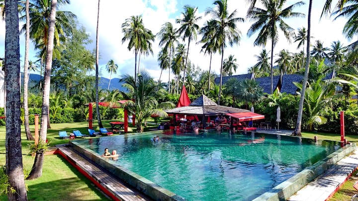 À 900 m du village, des marchés et des commerces les plus proches et de plusieurs restaurants (Klong Son).