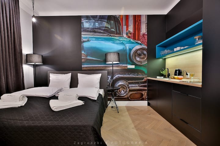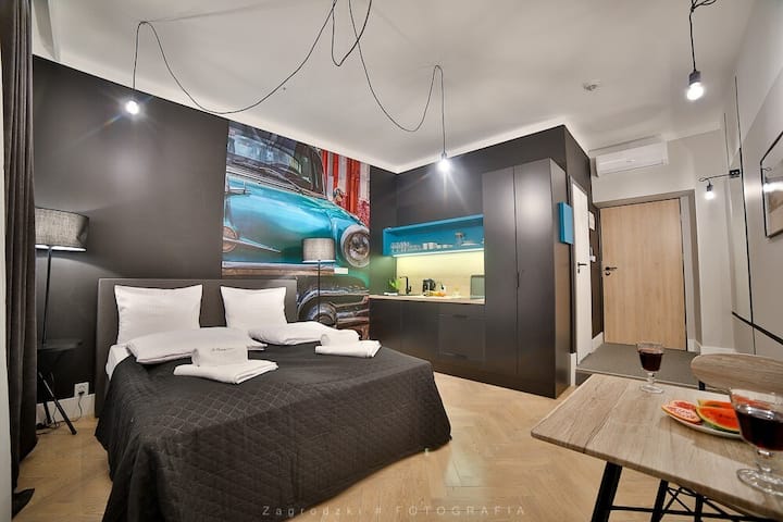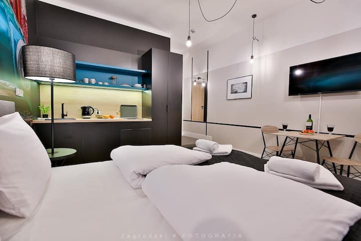 L'appartement se compose d'une grande pièce avec une kitchenette. Il y a 2 lits d'hôtel (90x200 cm) réunis en un. Il y a une possibilité de séparer les lits - si vous voulez que nous préparions l'appartement de cette façon, s'il vous plaît laissez-nous savoir :)
