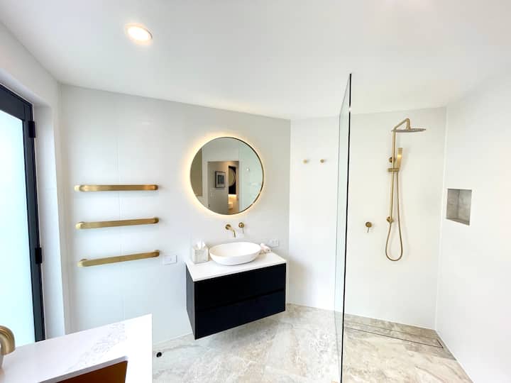 1 x chambre privée (rez-de-chaussée) adjacente à la salle de bain, avec lit Queen Size flambant neuf haut de gamme avec matelas à plateau-coussin moelleux, linge de maison de qualité, radiateur à huile, ventilateur Dyson sur pied et armoire intégrée avec miroir, télévision murale à écran plat de 43 pouces avec Netflix, Prime et Stan. Cette chambre est confortable et ancrée avec de nouveaux planchers en bois.
