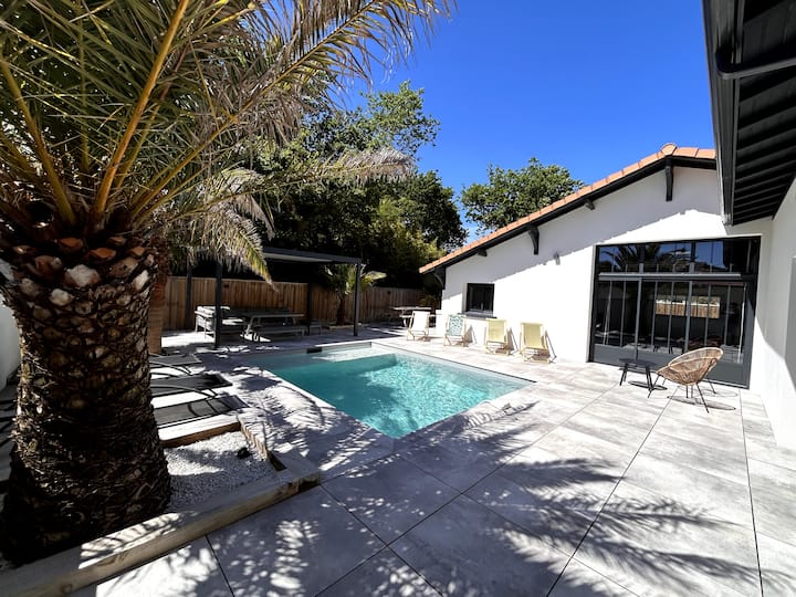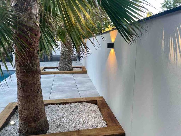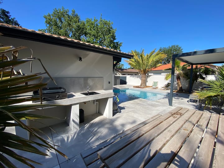 Les éléments suivants sont parfaits pour vos voyages en été : cuisine extérieure, lits de bronzage, piscine et espace repas en plein air.