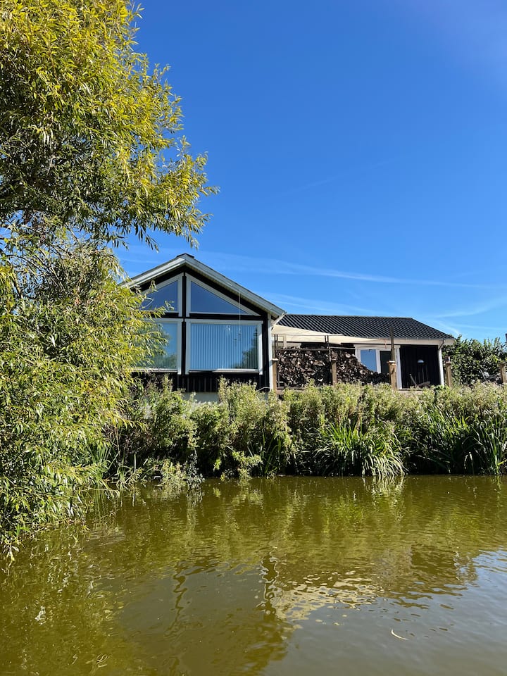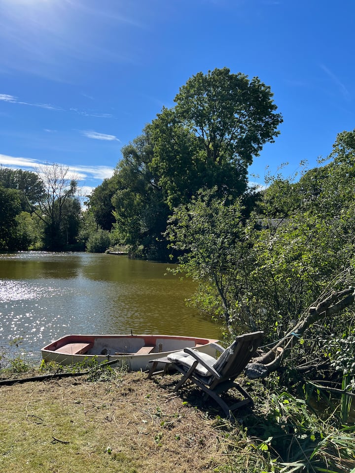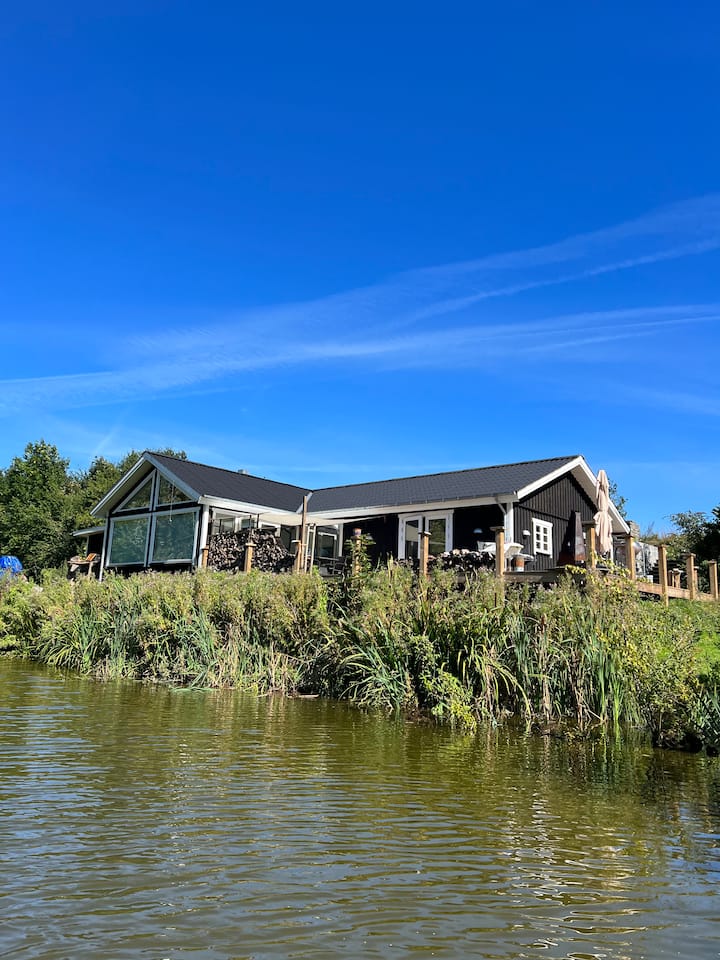 Maison neuve, près d'un petit lac.