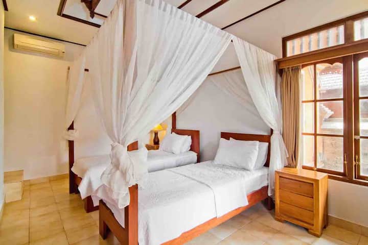 Chambre avec deux lits Frangipani dans un cottage balinais