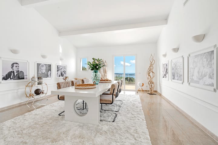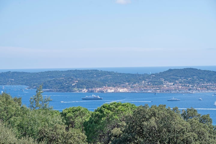 Les volumes des pièces principales de la maison, en enfilade (salons, salle à manger, cuisine), très rare, forment un superbe espace à vivre donnant sur différentes terrasses avec une vue somptueuse sur le Golfe de Saint-Tropez.