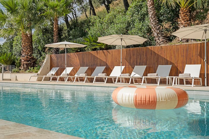 La villa est rénovée avec beaucoup de goût par les propriétaires. Une superbe cuisine donnant sur la terrasse avec espace barbecue et le coin salon de jardin puis la longue piscine surplombant le reste du jardin.