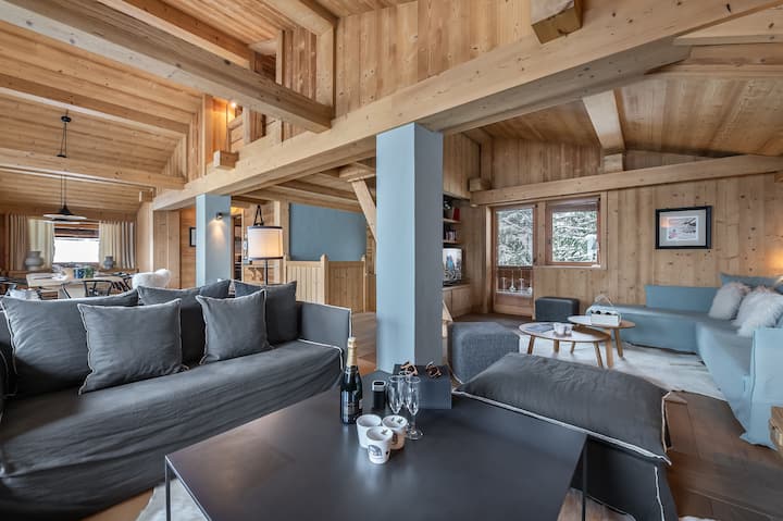 Le chalet Reine des Prés, situé à proximité de la télécabine de Rochebrune est un chalet idéal pour des vacances en famille à Megève. Une pièce de vie lumineuse, propose différents espaces, un salon télévision cosy, un salon cocooning et un bel espace repas, proche de la cuisine. Des couleurs douces telles qu’un gris bleu aux différentes nuances, se marient à merveille au bois clair qui compose le chalet. Les quatre chambres doubles et la mezzanine permettent de réunir 8 adultes et 2 enfants. Vous apprécierez également l’espace détente avec le jacuzzi intérieur et le sauna.