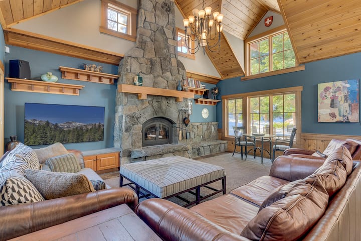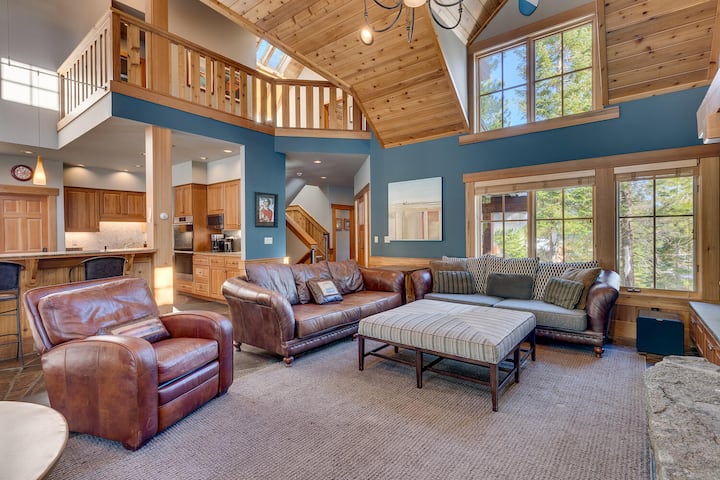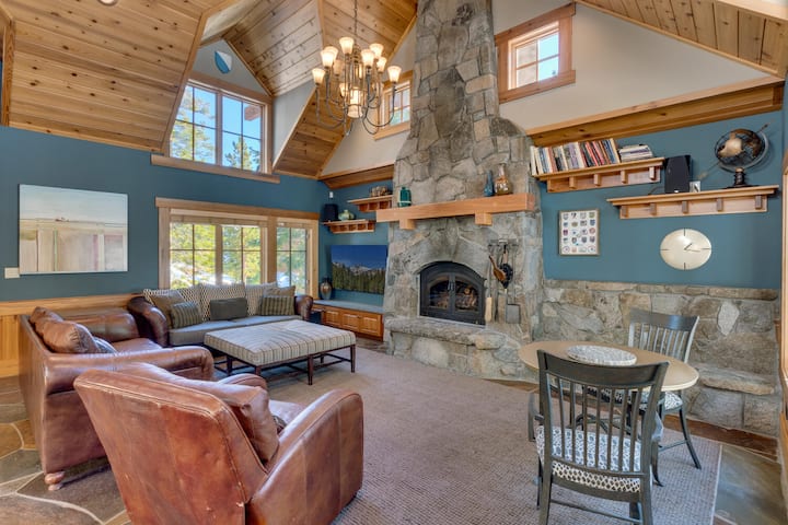 The Eagle 's Nest est une maison haut de gamme et décorée par des professionnels de Big Springs avec 5 chambres, 5 salles de bains et un jacuzzi extérieur privé. Idéal pour un rassemblement d'amis et de famille, avec de hauts plafonds de cathédrale, une cheminée à bois géante à partir d'énormes pierres de granit, un petit piano à queue, une table de billard et de la lumière flottant à travers de nombreuses fenêtres. Vous serez accueillis par de beaux sols en ardoise, des peintures à l'huile originales, des tapis de laine et des meubles en cuir fin dans les parties communes. Profitez du silence et du confort d'un chauffage radiant hydronique partout, ainsi que d'une connexion Internet par câble haut débit. Si vous venez en été, vous apprécierez la climatisation centrale, une caractéristique très rare dans cette région. Tahoe et les œuvres d'art alpines complètent l'architecture de style montagne.