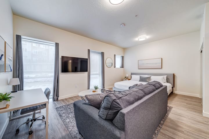 Cet appartement de plain-pied accessible aux fauteuils roulants dispose d'un accès à une grande salle de sport, une piscine, un jacuzzi, un club-house avec un billard et un jeu de palets, des barbecues, des foyers et des terrains de pickleball. À l'intérieur de l'unité, il y a un espace de travail désigné avec WiFi haut débit, ce qui en fait une excellente option pour les travailleurs à distance. Il y a une cuisine complète qui est entièrement approvisionnée avec des ustensiles de cuisine, du café et des produits de première nécessité. Idéalement situé à Draper, il offre un accès rapide à l'I-15.