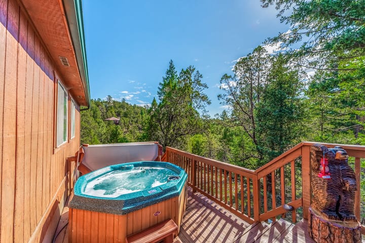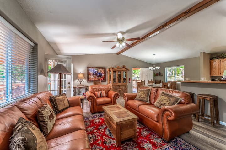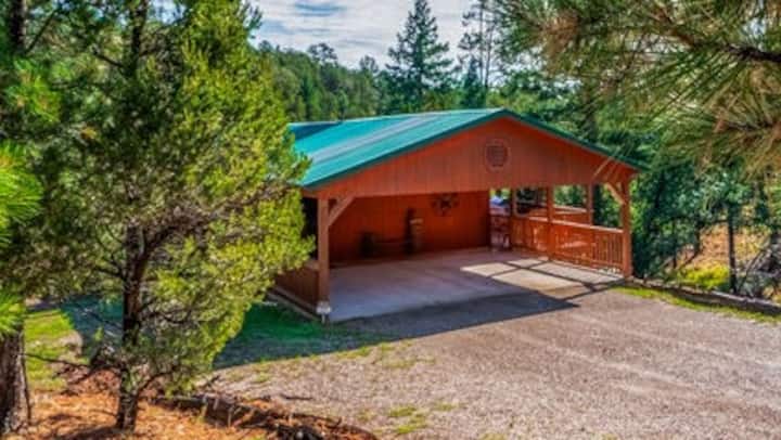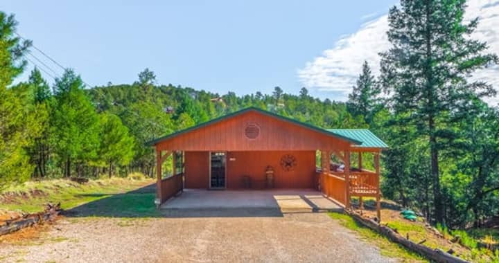 « Retreat to Comfort » à New Mexico Mountain Pine Cabin (NMMPC) ! Cette charmante cabane de plain-pied de 3 chambres offre une escapade reposante avec une vue imprenable sur la vallée. Niché sur un endroit isolé, le mélange confortable de mobilier moderne et rustique, y compris une magnifique cheminée à gaz en pierre, crée l'atmosphère de montagne parfaite. Profitez du jacuzzi ou du barbecue sur la terrasse arrière en vous imprégnant de la beauté de la nature. Avec un accès de niveau facile via l'abri de voiture et la climatisation centrale, NMMPC est la maison confortable idéale dans les montagnes !