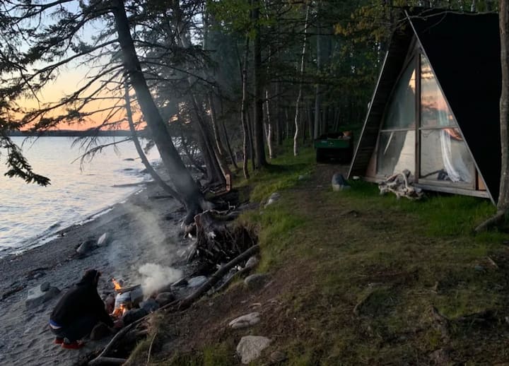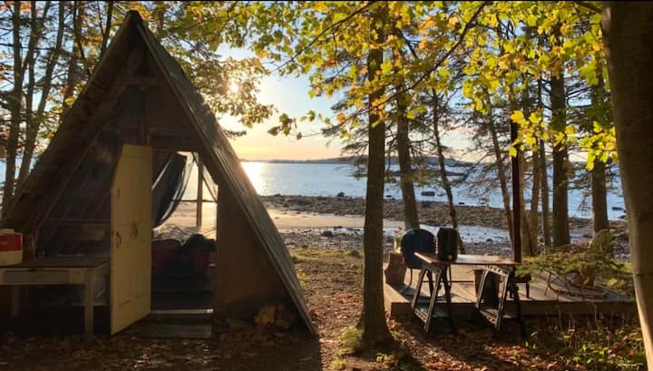 La propriété est éloignée et n'a pas de voisins immédiats, mais est entourée de 65 acres de terres publiques préservées avec des sentiers à travers les bois ; une forêt magique & plage accessible à pied. Se sent la plupart du temps comme une plage privée mais le site n'est pas entièrement privé. il y a une autre cabane et un camping à proximité. A-frame est loin de la foule du parc et juste assez loin de la route 1 pour que le bruit des moteurs soit à peine audible. Il y a deux autres sites de tentes, une autre cabane et notre maison ici, suffisamment espacées. Pendant les mois d'été, les homards bourdonneront dans la baie en extrayant leur prime de la mer.