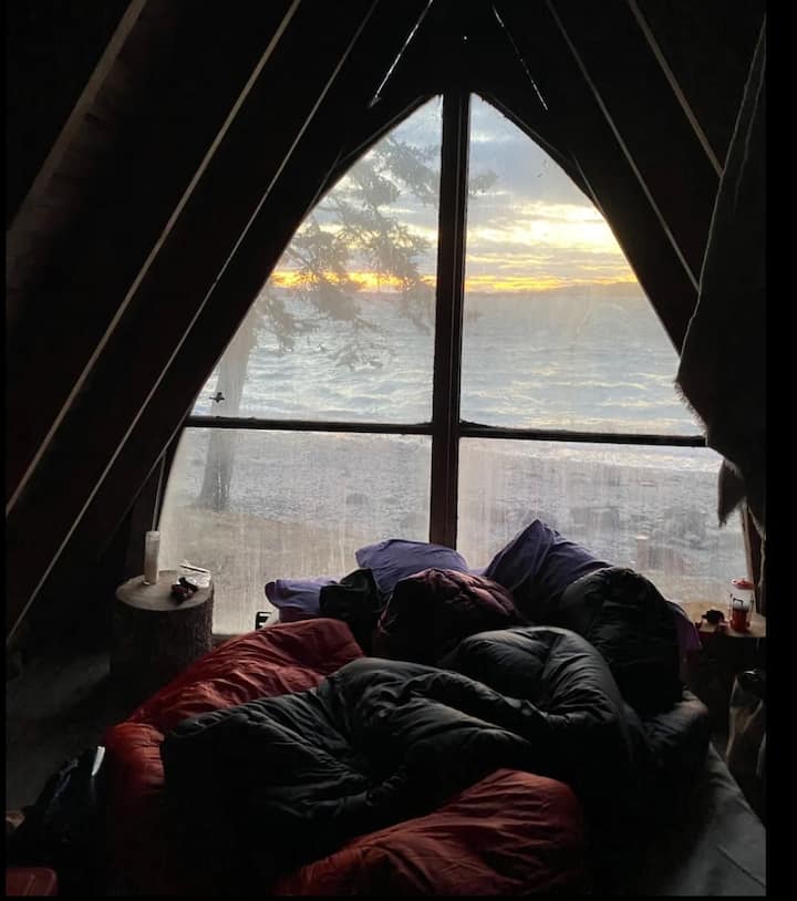 Contenu : lit double, cuisinière au propane à 2 feux, chauffage à copains (veuillez fournir votre propre bidon de propane de 1 lb si vous le souhaitez non plus, veuillez noter que nous ne fournissons pas de propane pour les voyageurs en été), 2 poêles en fonte, des jumelles, une petite grille pour cuisiner sur un feu de camp ouvert, un balai et une pelle, des livres/jeux, des chevaux de table/scie à utiliser à l'extérieur