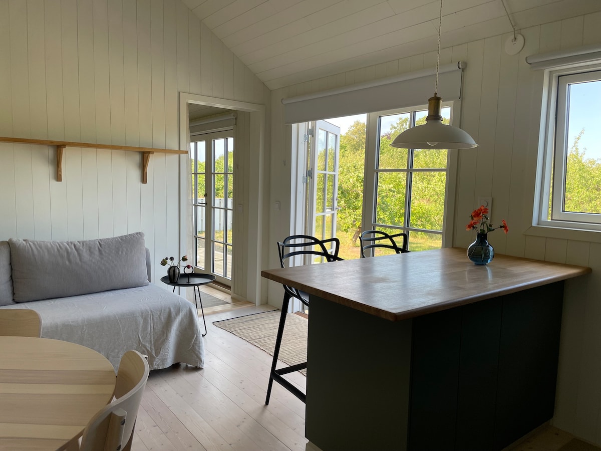 Maison d'hôtes confortable située dans un quartier luxuriant et pittoresque à la périphérie de Rörum à Österlen. La maison est toute neuve (terminée le printemps 2019) et offre tout ce dont vous pourriez avoir besoin dans la plus petite zone possible ! La disposition est ouverte. Accès à la mini cuisine, avec deux plaques chauffantes, kitchenette, salle de bain entièrement carrelée, ainsi que le loft à l'étage. Profitez de la proximité de la nature et de la baignade, du parc national de Stenshuvud, de Knäbäckshusens Strand et du village de pêcheurs Viks. À quelques minutes à pied, les parcours de golf, les jardins de Mandelmann et la Crêperie française.