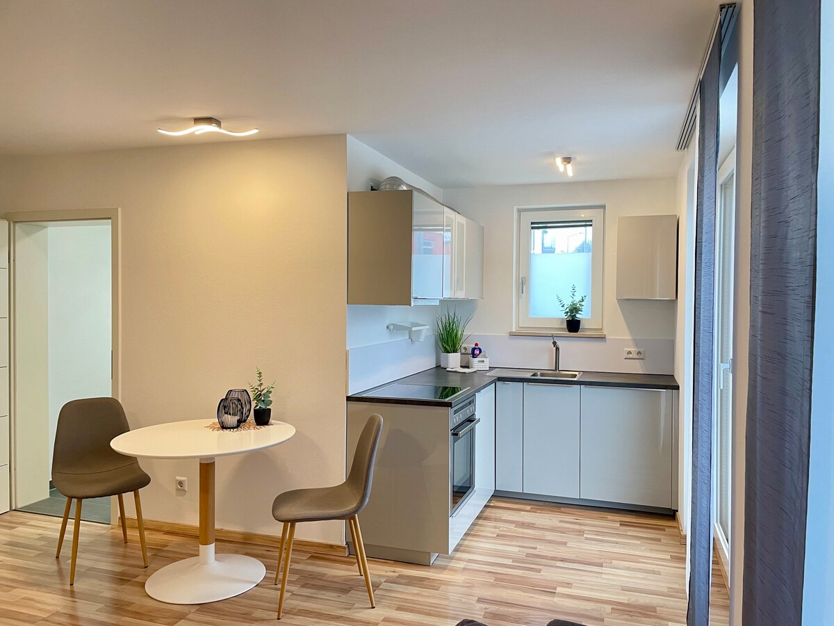 Détends-toi et offre-toi un moment de calme et de détente dans notre appartement d'une pièce de 25 m² récemment rénové et confortablement meublé à Hüttlingen. L'appartement est situé à l'étage supérieur d'une maison de 3 familles et peut accueillir au maximum 4 personnes (2 adultes + 2 enfants) Tu habites ici dans une zone à trafic limité et à quelques minutes à pied du centre du village où tu trouveras des boulangers, des bouchers, Edeka, des magasins de mode/chaussures, des glaciers et des restaurants.