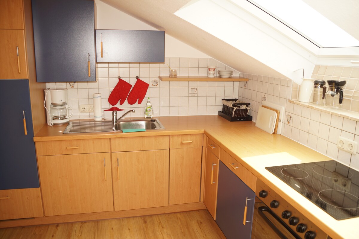 Notre appartement mansardé très calme dans une maison familiale avec un grand lit confortable, un coin canapé et une cuisine offre un sommeil réparateur dans une zone rurale calme. Pour Le lac de baignade avec entrée gratuite est à 10 minutes à pied. Région thermale de Geinberg, Bad Füssing Idéal pour les promenades à l'Inn (5 min à pied) ou les balades à vélo ! Taxe de séjour 2,40 € par personne/nuit.