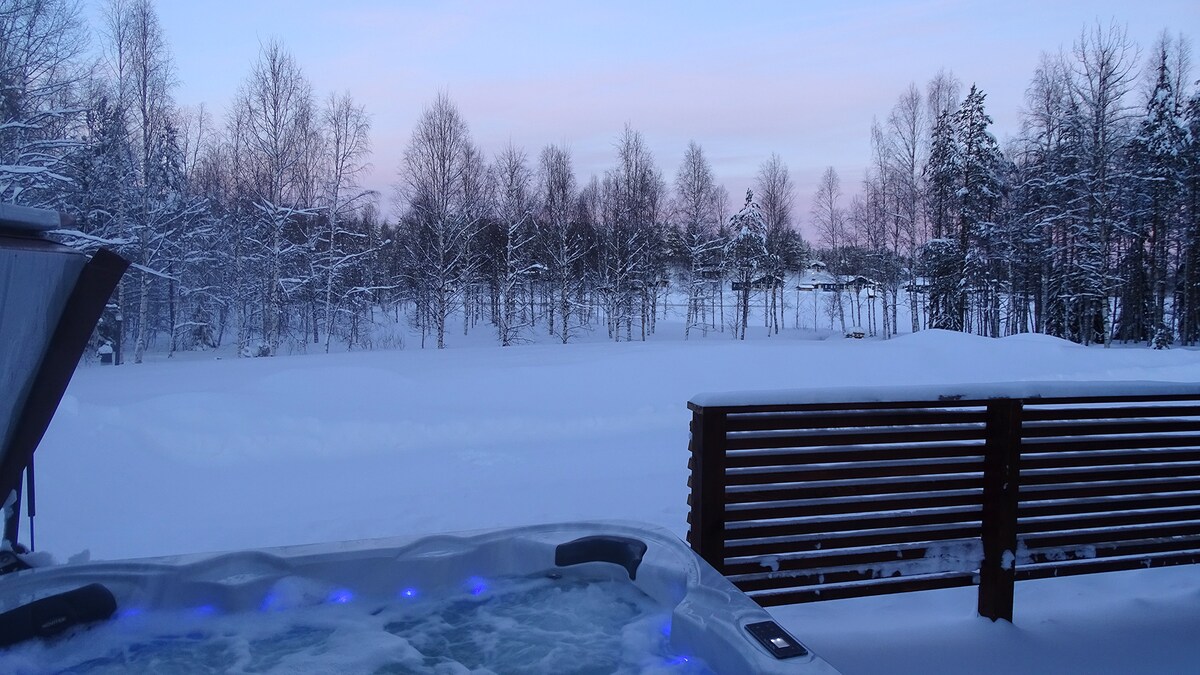 Your peace of Lapland! You are welcome to experience an authentic Lapland holiday! Here you will have an ecological Lapland handcrafted luxury wooden villa. The villa is located on a private peninsula. From the windows you can see an unique panoramic view of the lake. The distance to the beach is only 25 meters. You are in complete peace in the middle of nature.Sauna, jacuzzi, private barbecue hut and all the amenities!! It takes only 55 min. to Rovaniemi City (Santa's Village) by car.