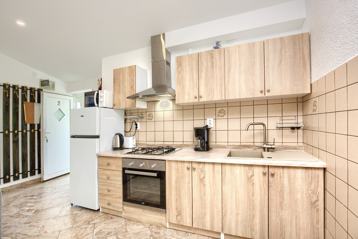« Appartement Lavanda - Studio confortable de 25 m² au bord de la mer, idéal pour des vacances » Situé à seulement 500 mètres de la mer cristalline, le studio Lavanda offre une combinaison parfaite de confort, de paix et d'atmosphère méditerranéenne. Sur 25 m² d'espace moderne, il offre : Lit double Un salon spacieux avec canapé-lit Cuisine équipée et salle à manger Salle de bain avec douche Terrasse avec vue sur la mer Parfait pour les couples, les familles et tous ceux qui veulent des vacances tranquilles au bord de la mer. Adresse : Barbariga 11, Vodnjan